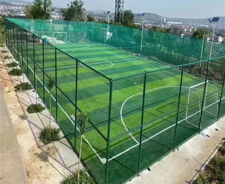 足球场围网金属丝包塑编制,在平米紧绷的情况下还能有一定的弹性,有利避免人员碰撞伤害,减足球碰撞后的反弹力度。