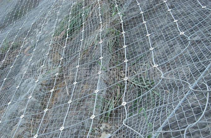 主动山体防护网低下是用钢丝编制的菱形网铺垫,再钢丝绳编制的菱形网覆盖,由锚杆固定。山体风化剥落的石块不会坠落
